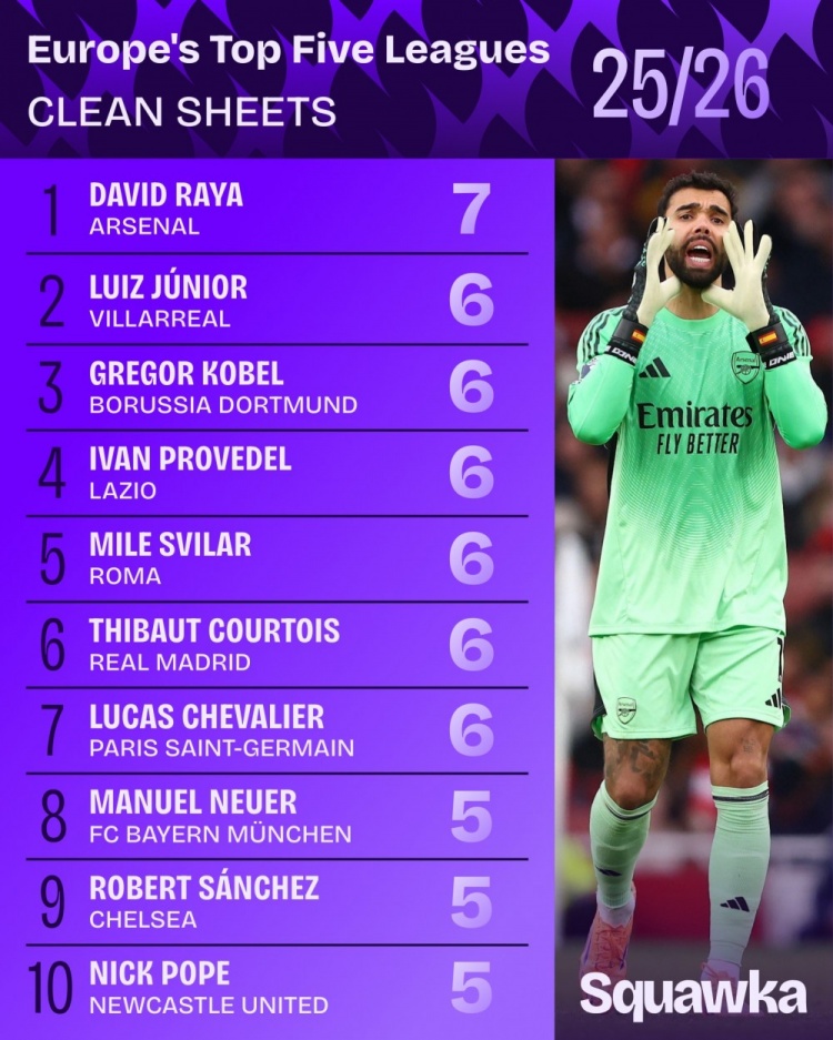 11月21日讯 五大联赛战火行将重燃,数据机构squakwa也统计了本赛季五大联赛门将零封场次榜,枪手门将拉亚居首。