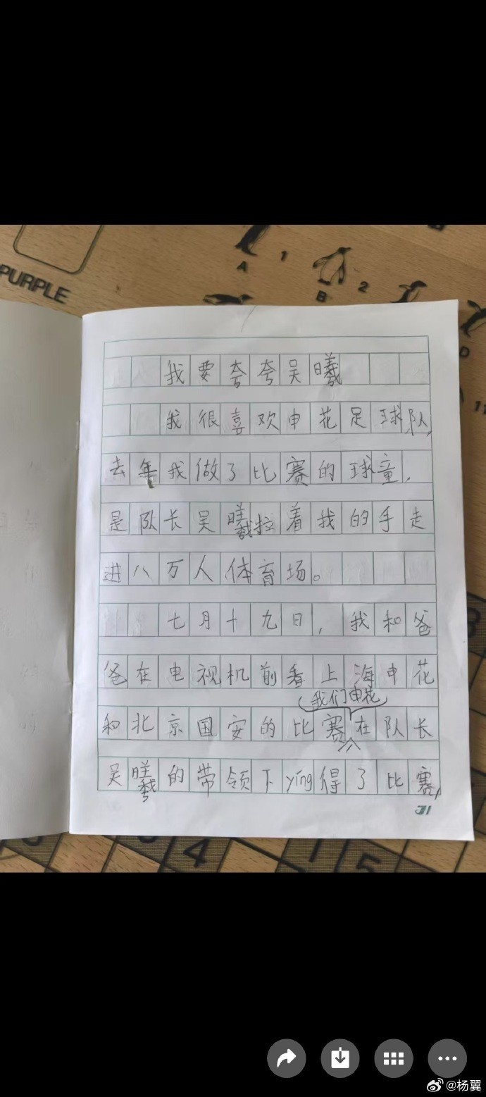 7月28日讯 今天,申花跟队记者杨翼在社媒晒出了一位小一又友写的对于吴曦的作文。