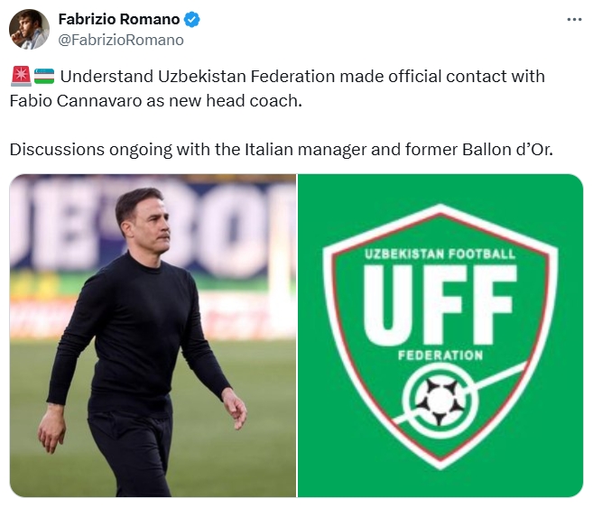 罗马诺:卡纳瓦罗获乌兹别克斯坦足协精致构兵,正接头握教国度队