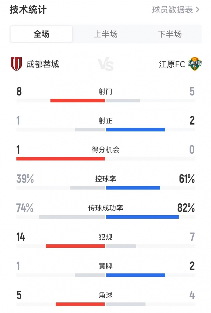 蓉城1-0江原FC数据: