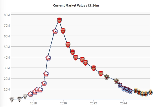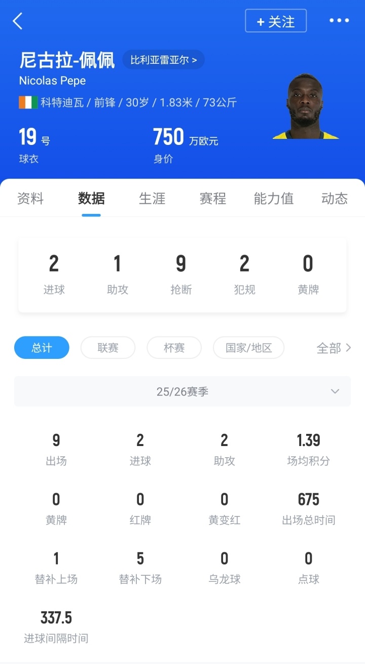 阿森纳第一水货西甲更生💪佩佩身价回涨至750万欧,为巅峰1/10