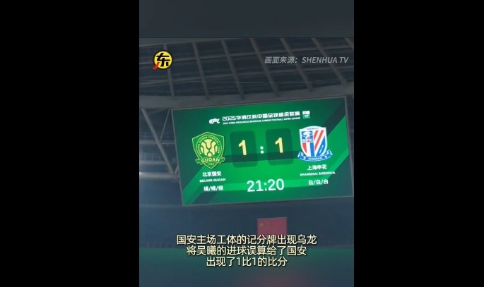 上轮国安主场对阵申花,申花开场依靠阿苏埃和吴曦的进球赢得2-0的卓绝,然则当吴曦打进第二个进球时,工体记分牌出现乌龙,比分造成1-1平,几秒钟之后比分牌就改成0-2。