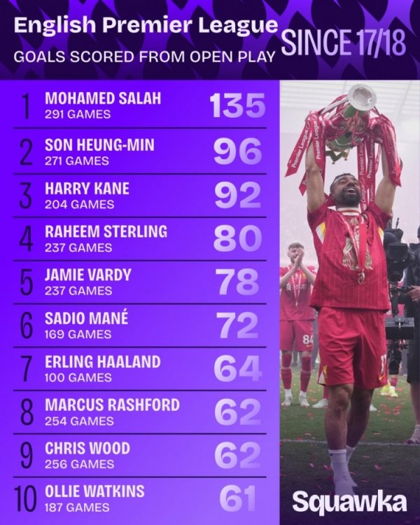 9月7日讯 squakwa统计了17-18赛季以来的英超清爽战进球情况,萨拉赫135球断崖领跑。 17-18赛季以来英超清爽战进球榜: 1.萨拉赫,291场,135球 2.孙兴慜,271场,96球 3.哈里-凯恩,204场,92球 4.斯特林,237场,80球 5.瓦尔迪,237场,78球 6.马内,169场,72球 7.哈兰德,100场,64球 8.拉什福德,254场,62球 9.克里斯-伍德,256场,62球 10.沃特金斯,187场,61球......查看更多