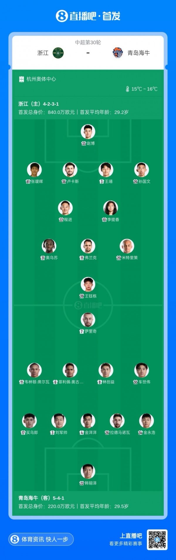 中超保级战|浙江vs海牛首发:弗兰克告别战先发,王钰栋出战