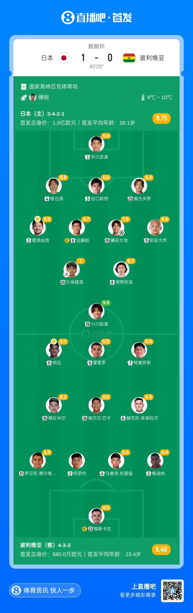 半场-日本暂1-0玻利维亚 镰田地面破门久保建英献助攻