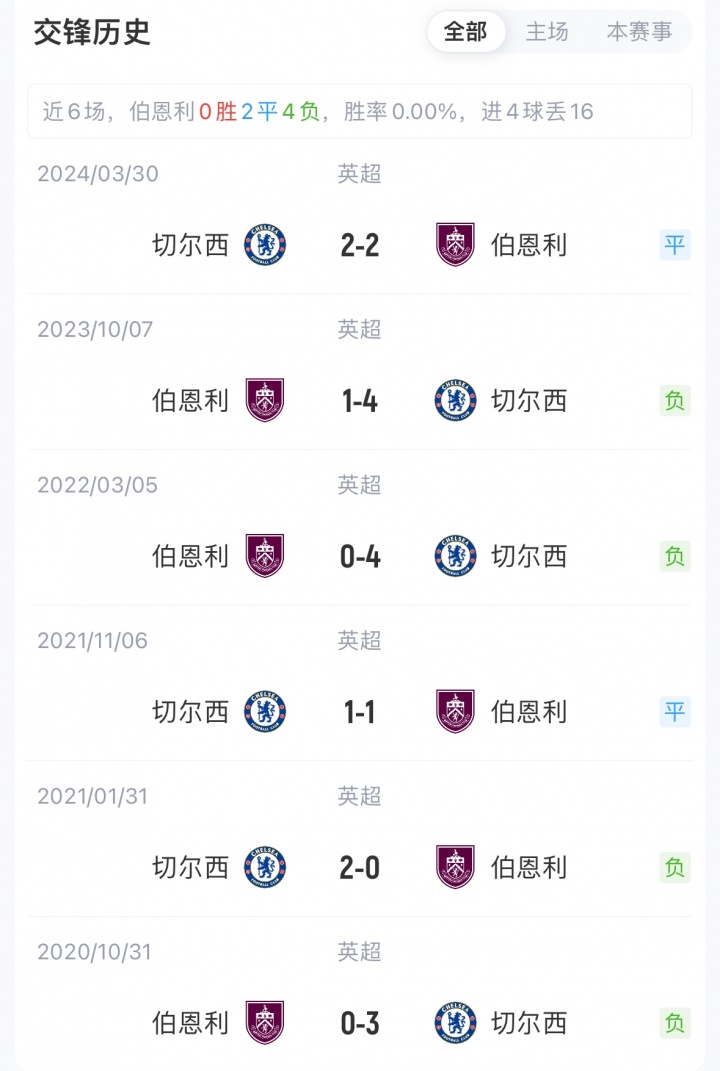 现在,切尔西6胜2平3负积20分位列第3;伯恩利3胜1平7负积10分位列第17。两边近6次交锋,切尔西4胜2平保抓不败。