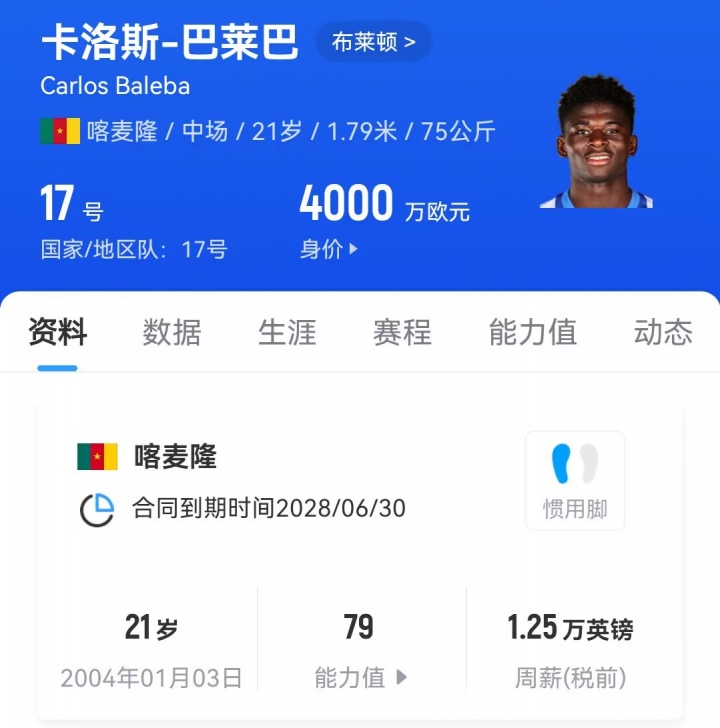 巴莱巴与布莱顿的现存合同2028年到期,另有一年续约选项,球员当今的德回身价为4000万欧元。此前有报说念称布莱顿对巴莱巴的估价高达1亿英镑。