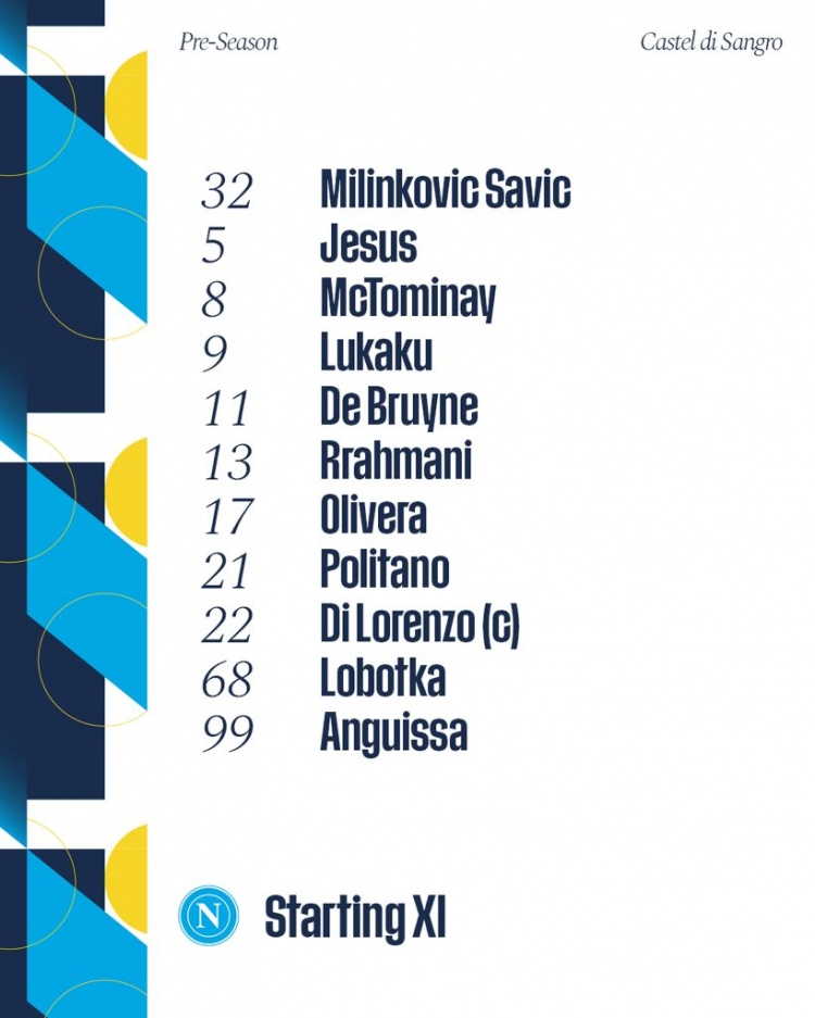 那不勒斯首发:32-瓦尼亚-米林科维奇-萨维奇、5-胡安-热苏斯、8-麦克托米奈、9-卢卡库、11-德布劳内、13-拉赫马尼、17-马蒂亚斯-奥利维拉、21-波利塔诺、22-迪洛伦佐、68-洛博特卡、99-安古伊萨