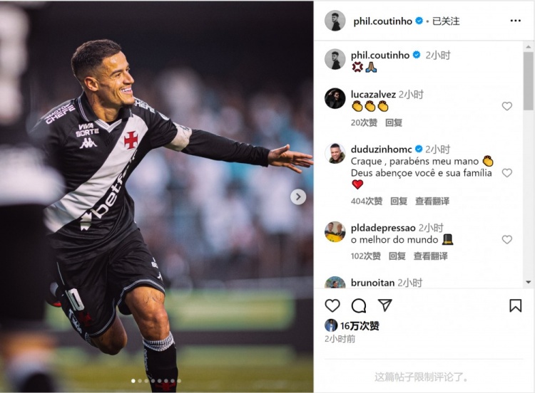 库蒂尼奥社媒晒出多张赛场像片,庆祝球队取胜,其中包括与内马尔的赛场同框照。