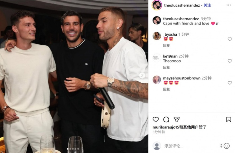 7月23日讯 特奥在个东谈主社媒晒出与兄弟卢卡斯-埃尔南德斯以及法国同族帕瓦尔约会合影,配文写谈:“与一又友们在卡普里岛渡过有爱的时光。”
