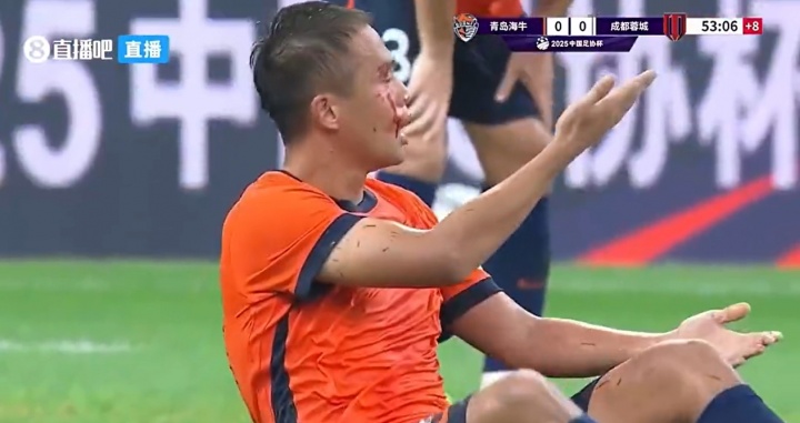 今晚足协杯,青岛海牛vs成都蓉城,上半场补时终末阶段,德尔增多无球气象肘击孙正傲,孙正傲脸部出血!裁判看VAR后出红牌!两边王人10东说念主应战!