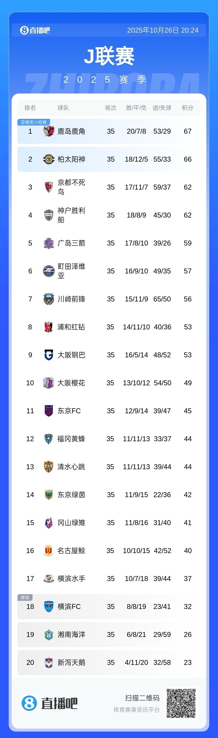 10月26日讯 J1联赛第35轮,湘南海洋客场0-1不敌福冈黄蜂,提前3轮细目左迁,时隔8年再度回到J2联赛。