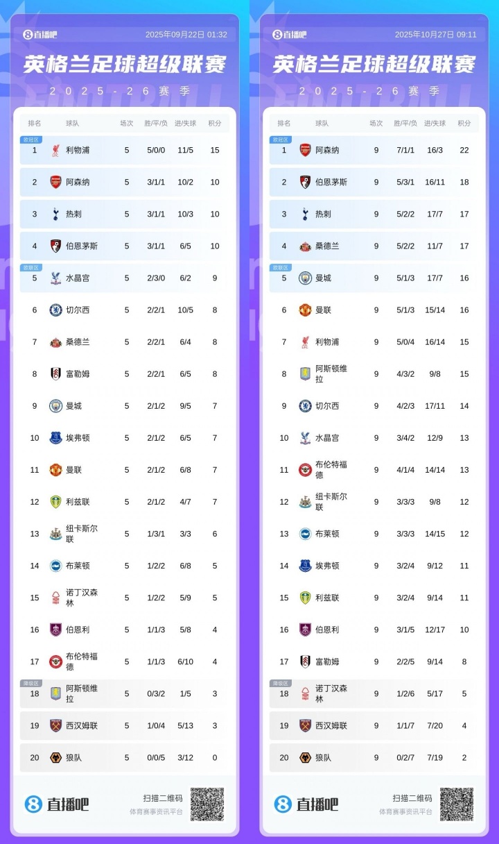 10月27日讯 英超第9轮一皆战罢,积分榜上出现了道理的一幕。