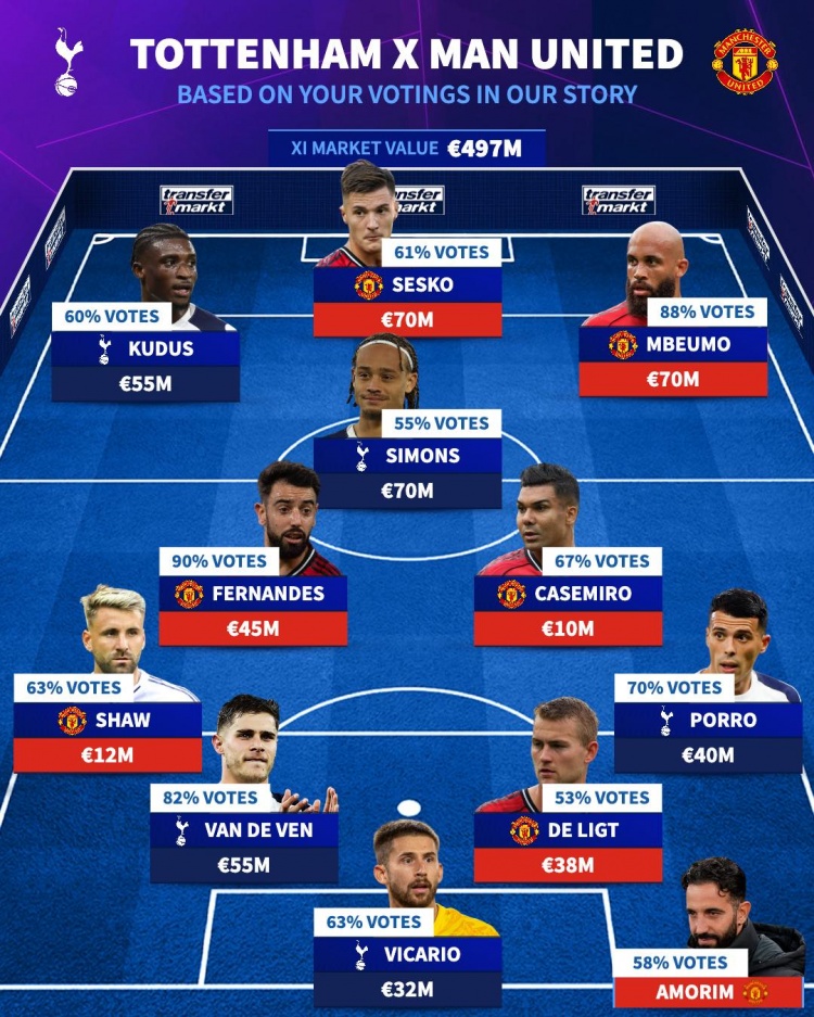 德转票选热刺+曼联声势:B费、舍什科、西蒙斯在列,主帅阿莫林