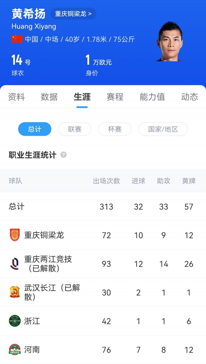 黄希扬是别称地浮浅说念的重庆籍球员,做事生存也肇端于重庆队,之后他曾经转折河南、杭州绿城、武汉长江,在2020年他又加盟重庆力帆。