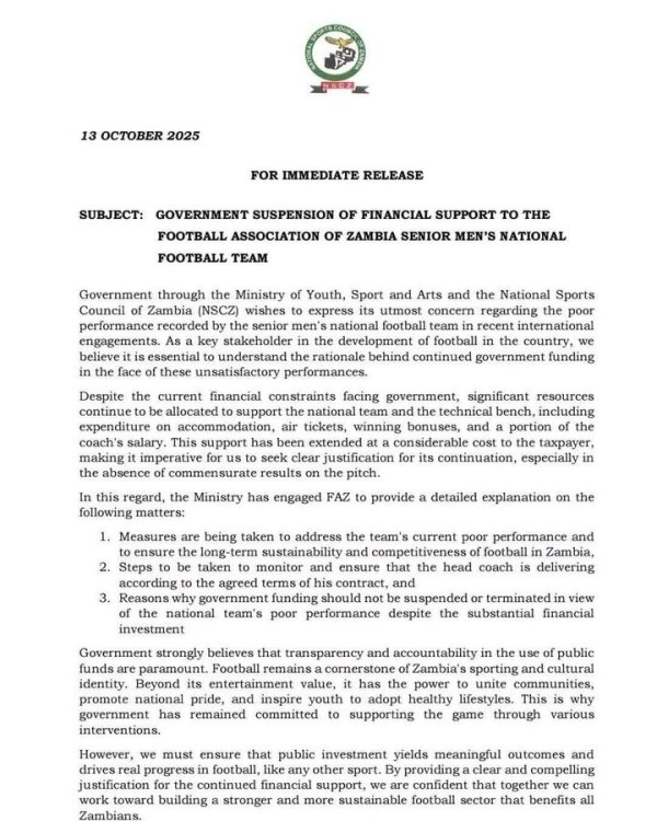 国度队发扬欠安,赞比亚政府暂停财政撑执:要对征税东说念主正经