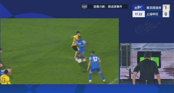 马纳法倒地,主裁看VAR判罚点球!吴曦点射掷中,申花1-1西海岸