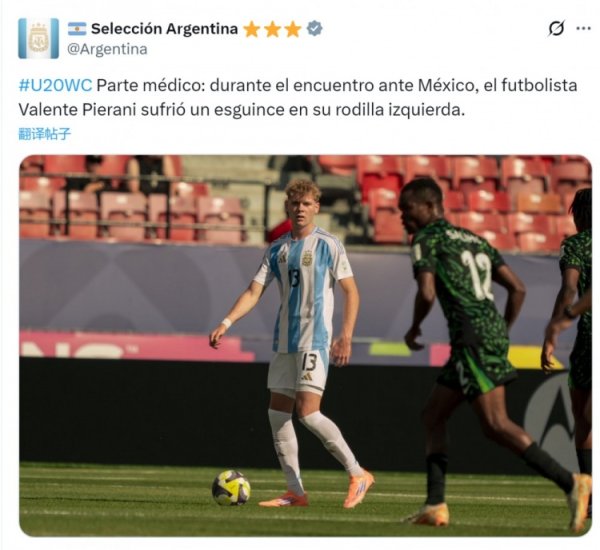 官方:阿根廷U20主力中卫皮埃拉尼左膝扭伤,此前承接4场首发