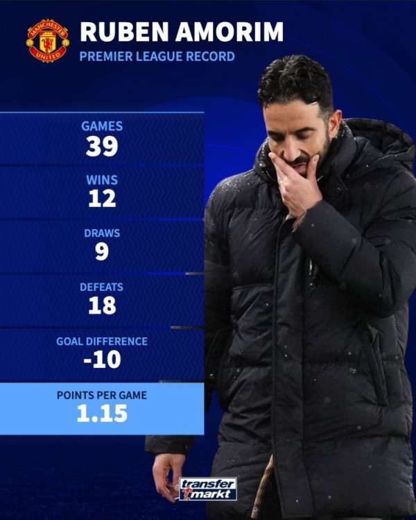 阿莫林抓教曼联英超战绩:12胜9平18负,净胜球-10,场均1.15分