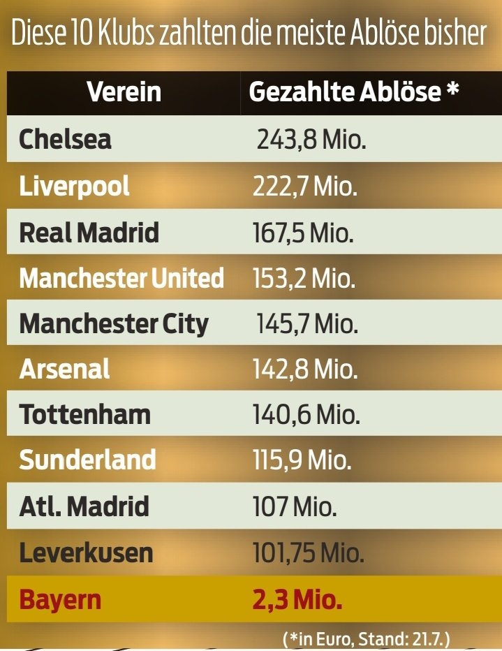 7月23日讯 知名拜仁自媒体号Bayern & Germany转载了一则今夏足坛在开销上排在前哨的俱乐部盘货,拜仁被列在了最底下行为对比。