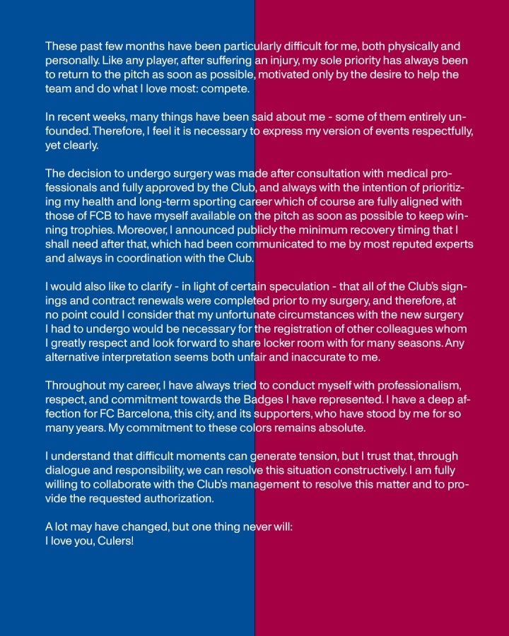 手术决定是在与医疗团队协商后作出的,并得到俱乐部的全齐认同。此举持久以我的健康和永久作事生存为高大磋议,而这当然与巴萨的相干全齐一致:让我尽早以最好景色追思,不绝为冠军而战。此外,我已公开告示术后所需的最短规复期,这一时辰基于巨擘巨匠的评估,且持久与俱乐部保执同步。