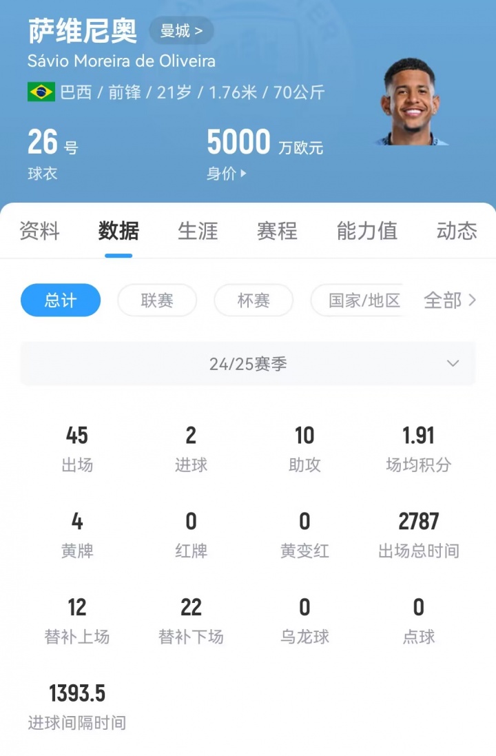 21岁的萨维尼奥上赛季为曼城出战45场,孝顺2球10助攻。球员当今的德回身价为5000万欧元。