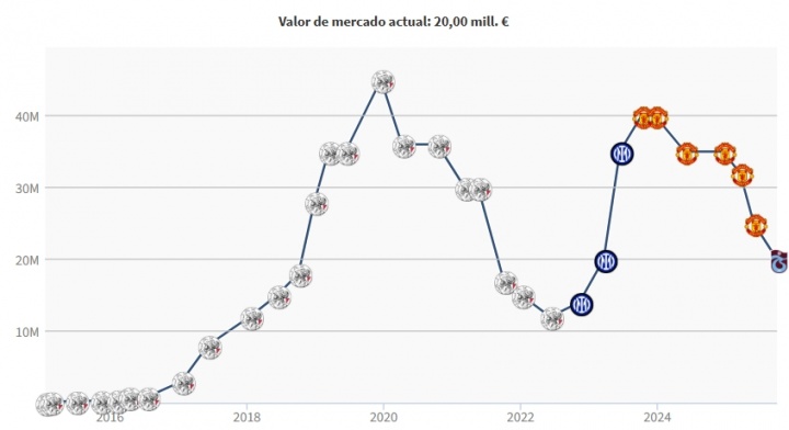 奥纳纳2023年夏窗以5000万欧元从国米转会曼联,其时他的身价为3500万欧元。加盟曼联后奥纳纳的身价涨至4000万欧元,尔后屡次下落。