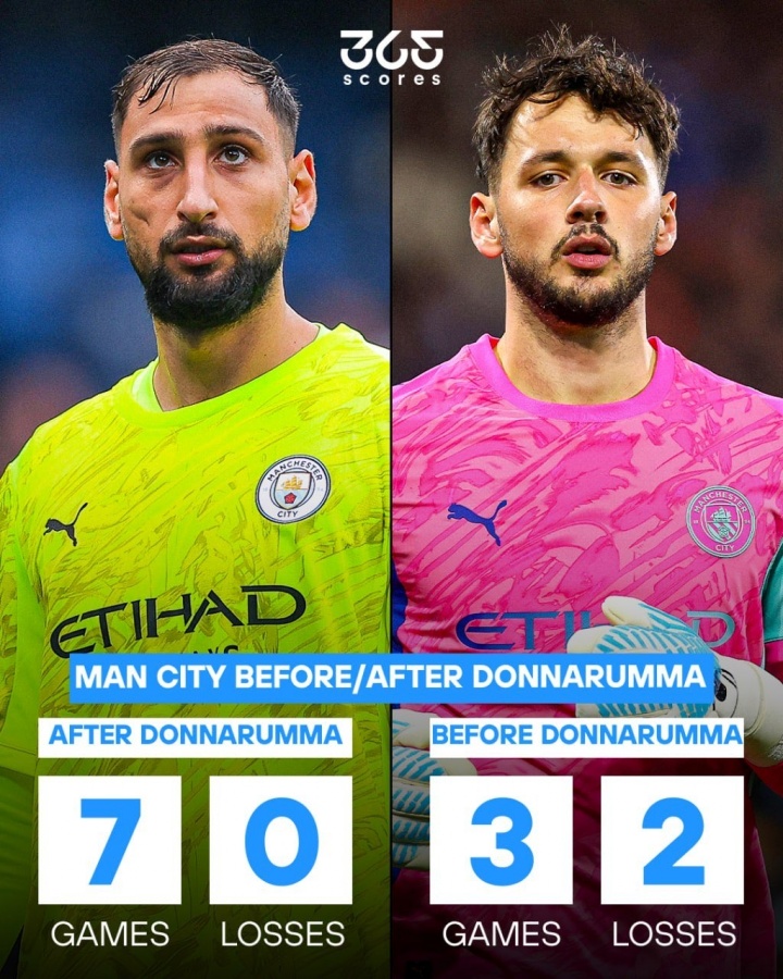 门将多纳鲁马在其中可谓居功至伟:他加盟曼城后立即成为了球队的成例首发,出战6场比赛(包含4场英超、2场欧冠),孝顺3场零封,此外只丢掉4球。