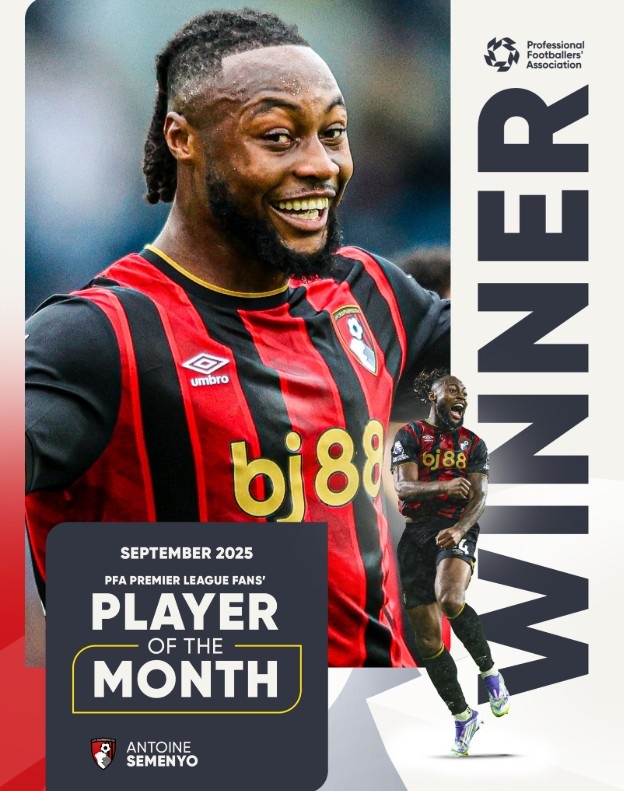 10月13日讯 PFA(英格兰管事球职工会,Professional Footballers' Association)官方告示,伯恩茅斯边锋塞梅尼奥当选球迷票选英超9月最好球员。