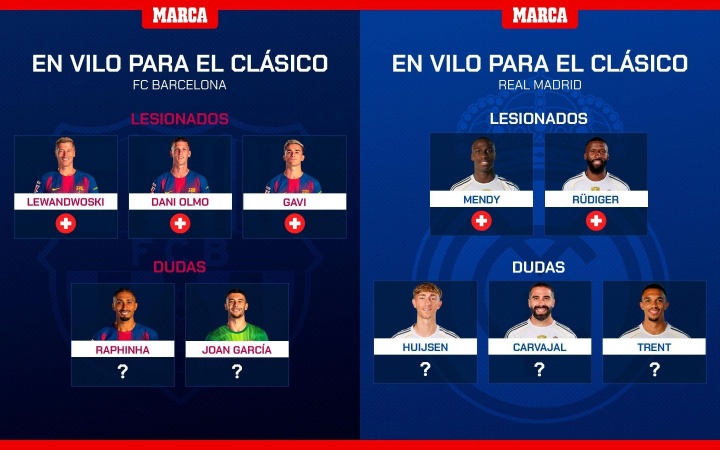 10东说念主伤缺?皇马巴萨缺席月底德比东说念主员:巴萨3伤2疑,皇马2伤3疑