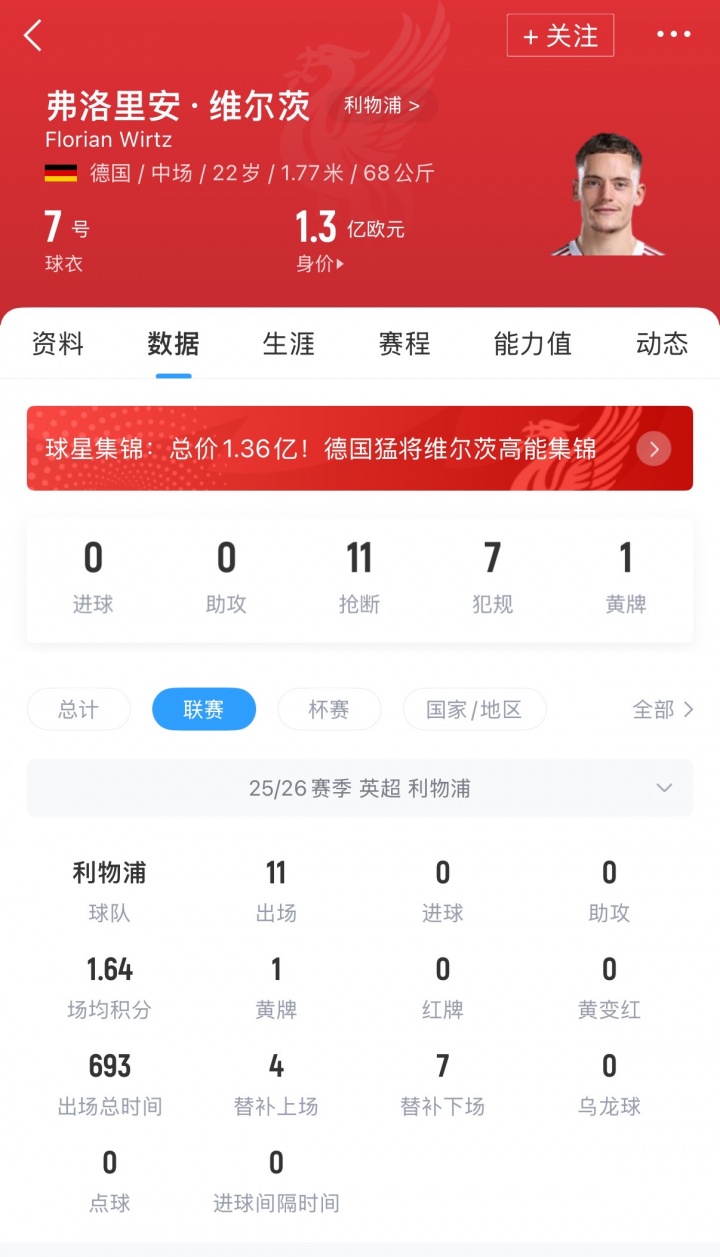 维尔茨在今夏以1.25亿欧元转会费加盟利物浦,当今这位德国中场在英超出场11轮后仍莫得得到进球以及助攻。