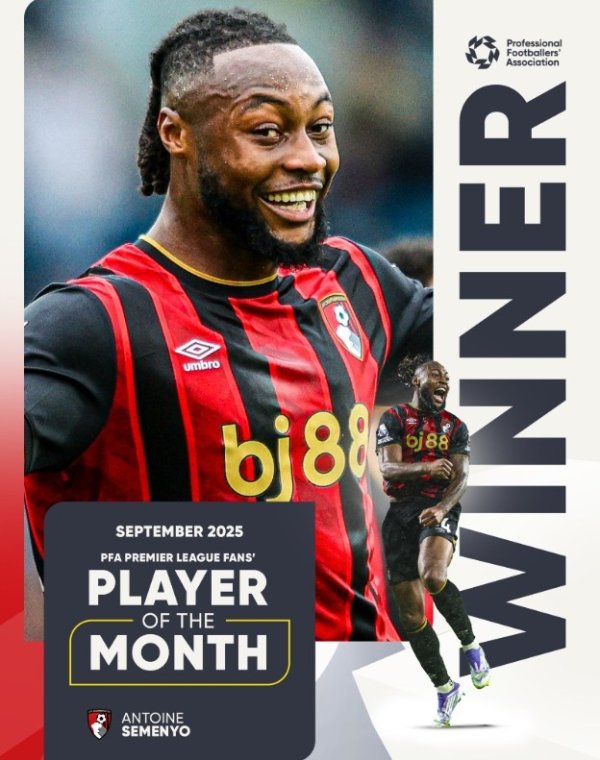 “樱桃”大杀器!PFA官方:3场两球1助,塞梅尼奥当选9月最好球员