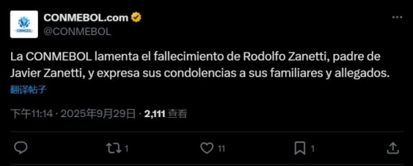 南好意思足联吊唁萨内蒂父亲:向他的家东谈主和一又友致以古道的慰问