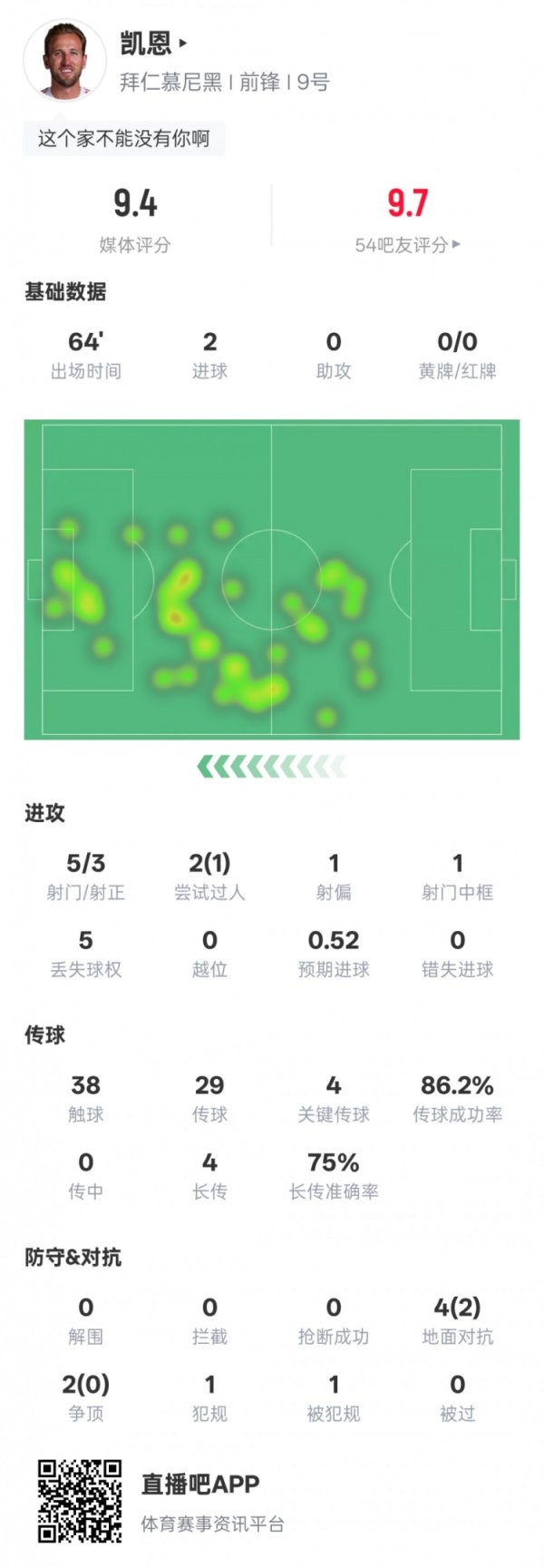 凯恩本场比赛数据:2进球4关节传球1过东谈主告捷1中框,评分9.4