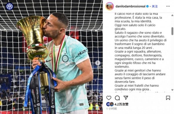 8月30日讯 当天,国米旧将丹布罗西奥在个东说念主Ins上发表长文,告示退役。 原文如下: 13岁离家追梦,如今是技艺告别了。足球不仅是我行状,更是我的家、我的学校、我的身份。今天,我不仅是向绿茵场告别,亦然向一经的我方告别,并招待当今的我。20年的行状生活,让我有幸将儿时的梦念念变为实验。 感谢每支队伍、每位耕作、队友、医师、理疗师、仓库科罚员、厨师、做事员以及每一位守旧我的球迷。感谢父母,他们有勇气欺压让我去追赶梦念念,莫得给我任何包袱。感谢昆仲们与我共享每一个欣喜。感谢......查看更多