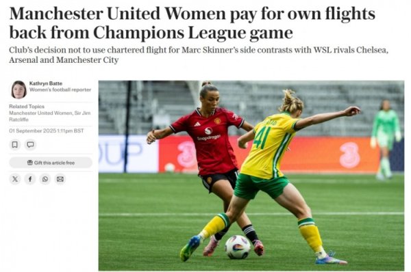电讯报:曼联让女足私费购买欧冠客场返程机票,部分球员很震怒