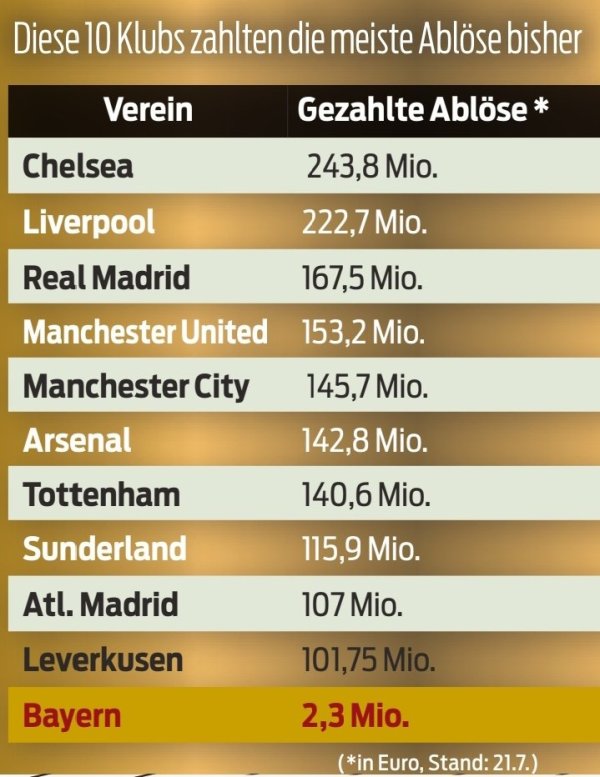 7月23日讯知名拜仁自媒体号Bayern & Germany转载了一则今夏足坛在开销上排在前哨的俱乐部盘货,拜仁被列在了最底下行为对比。 1-切尔西 2.438亿欧 2-利物浦 2.227亿欧 3-皇马 1.675亿欧 4-曼联 1.532亿欧 5-曼城 1.457亿欧 6-阿森纳 1.428亿欧 7-热刺 1.406亿欧 8-桑德兰 1.159亿欧 9-马竞 1.07亿欧 10-勒沃库森 1.0175亿欧 拜仁 230万欧......查看更多