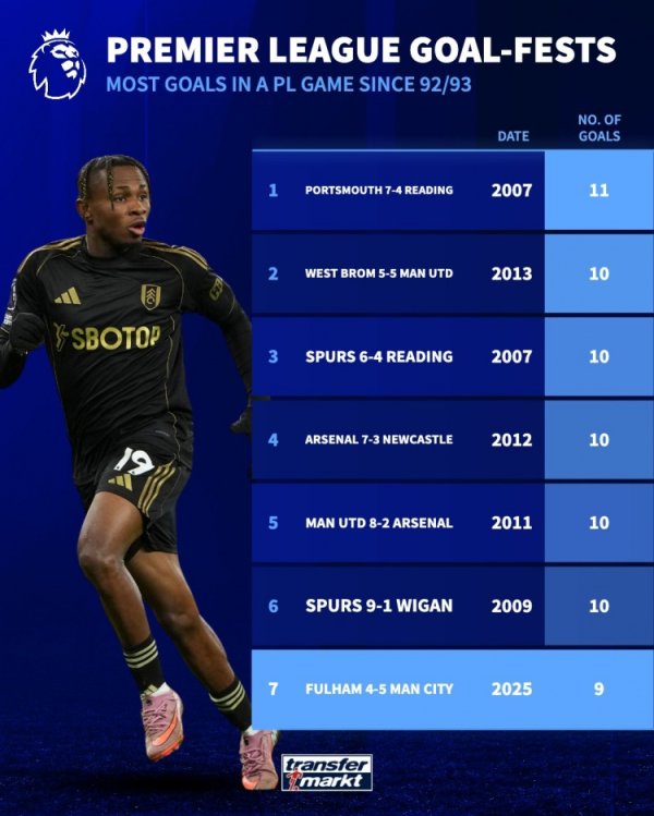 富勒姆vs曼城出现9粒进球,英超历史单场比赛进球第7多