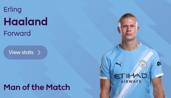 解锁英超百球+造3球!英超官方:哈兰德当选富勒姆vs曼城全场MVP