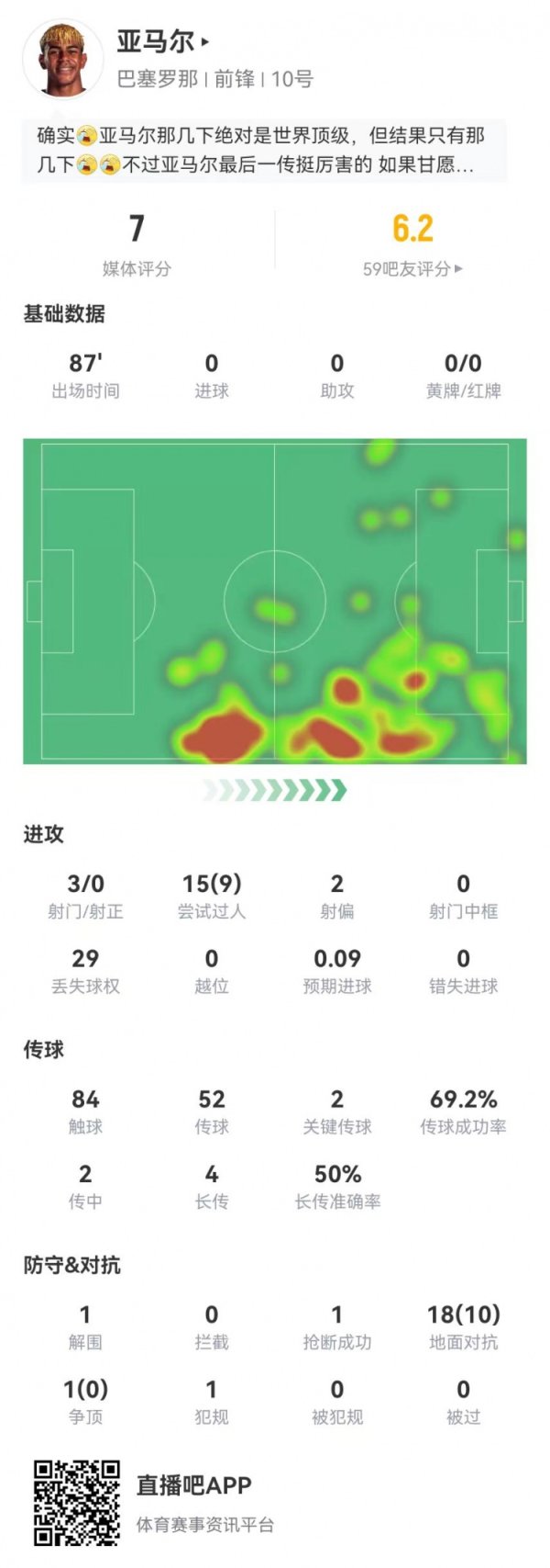 亚马尔本场3射0正 2要害传球+29丢失球权 15过东说念主9到手 获评7分