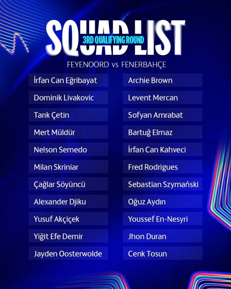 8月5日讯 费内巴切公布了欧冠阅历赛第三轮对阵费耶诺德大名单,恩内斯里、弗雷德、阿姆拉巴特、什克在列,夏窗新援阿奇-布朗、塞梅多、杜兰入选。