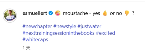 08月10日讯 穆勒笃定加盟温哥华白浪后,行将开启全新的糊口。近日,穆勒在社媒上发布了一张留着小胡子的像片。