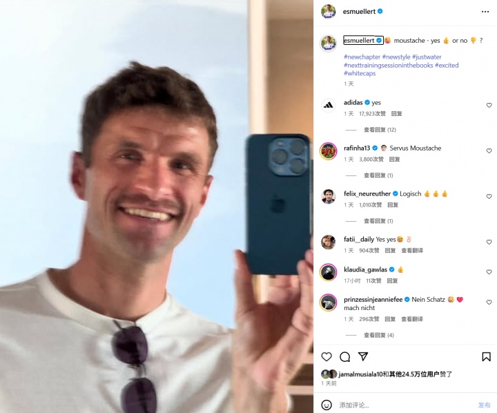 穆勒在社媒上发布了一张略显无极的自拍照,脸上新留了胡子,笑貌满面。他还径直问粉丝们要不要留胡子。