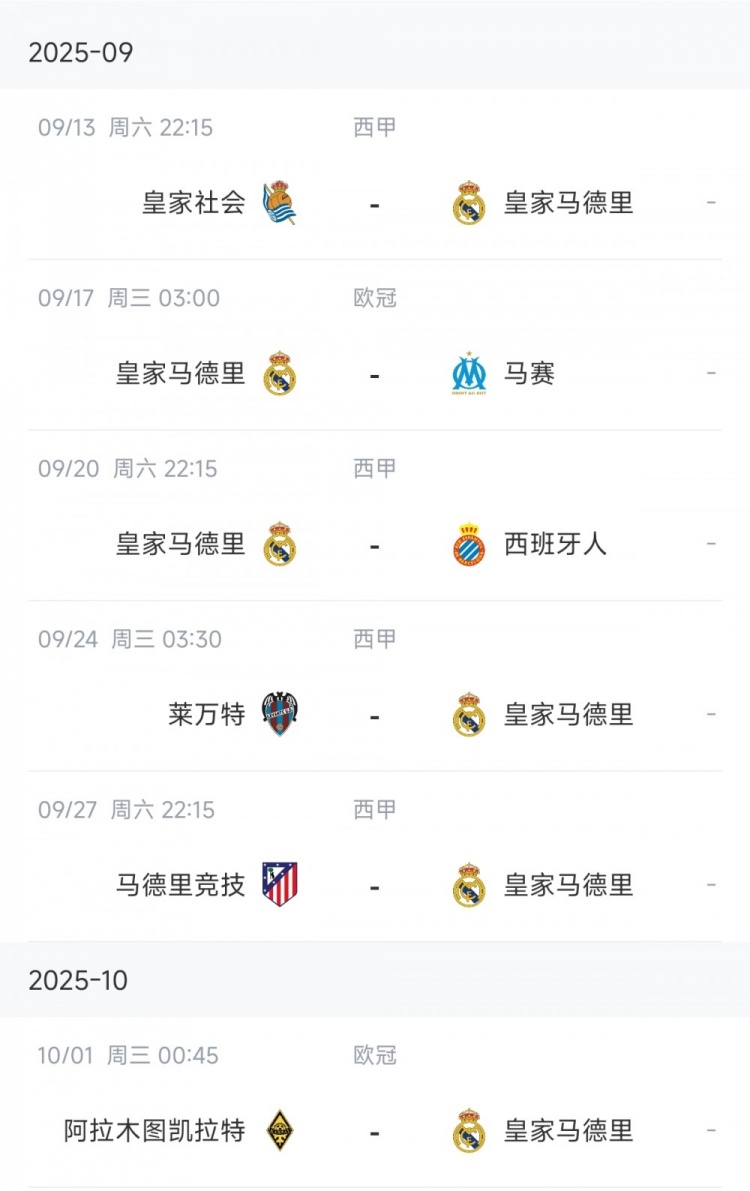 终末两场则是重头戏。率先是9月27日的马德里德比,敌手是马竞。随后皇马需要远征8000公里外的哈萨克斯坦,于10月1日与阿拉木图凯拉特进行欧冠小组赛第2轮的对决。