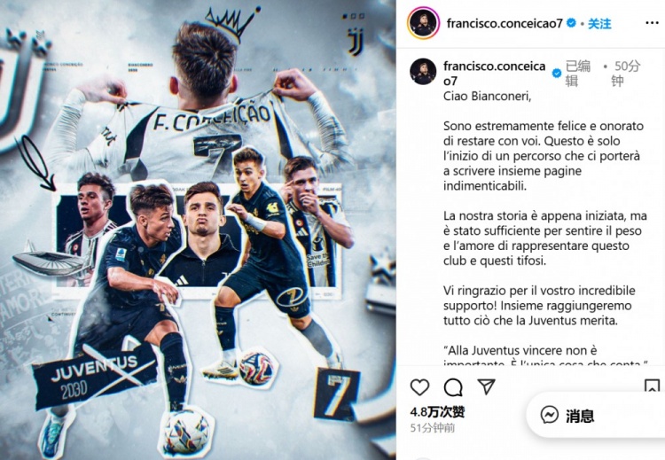 7月24日讯 在永久加盟尤文后,小孔塞桑更新了酬酢媒体。
