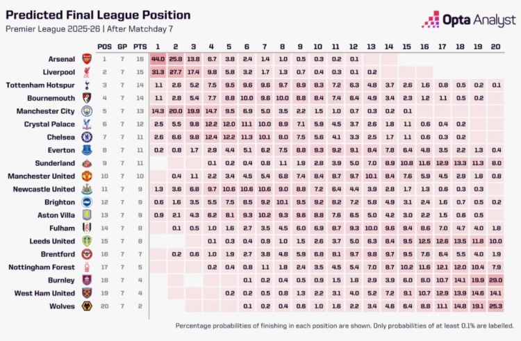 10月15日讯 英超七轮事后,数据机构OPTA超等臆度机瞻望本赛季英超冠军↓