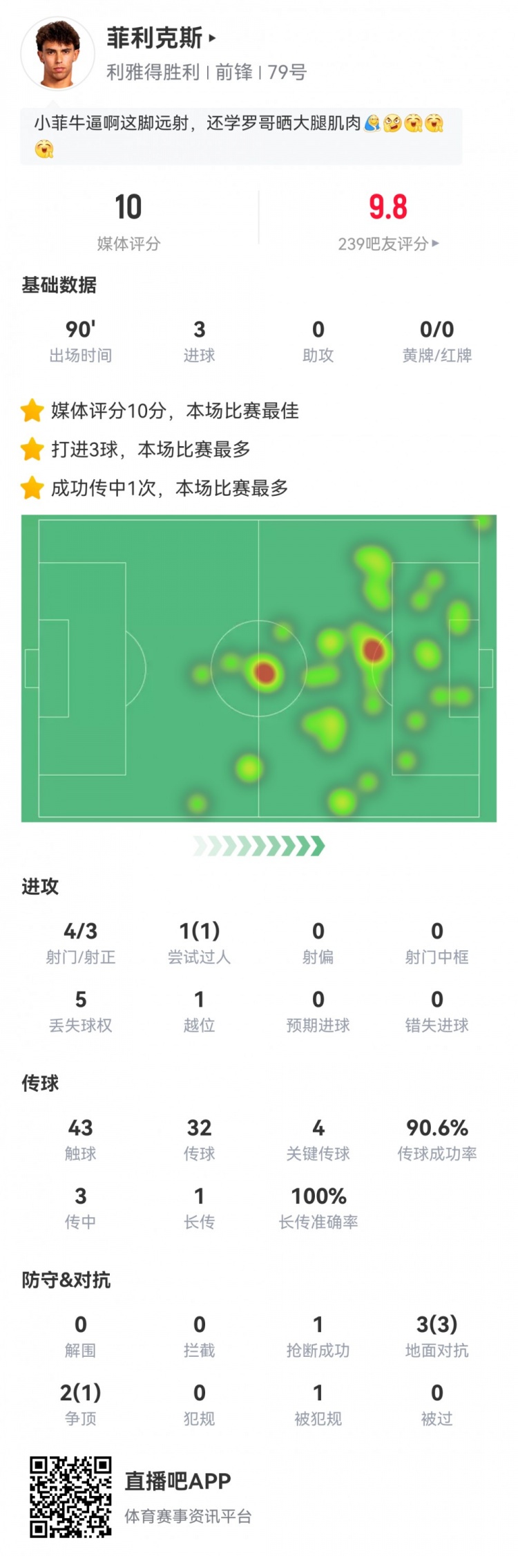 戴帽!菲利克斯数据:4射3正3进球,4次纰谬传球,获评10分满分