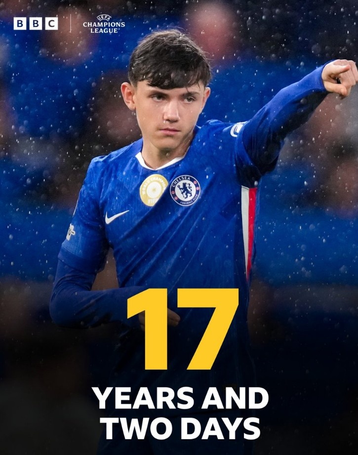 据统计,17岁的沃尔什创造了蓝戎行史最年青欧冠登场记载。