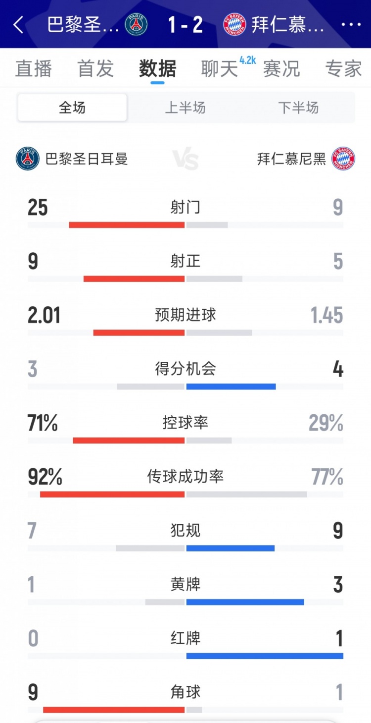 拜仁2-1巴黎全场数据:射门9-25,射正5-9,得分契机4-3