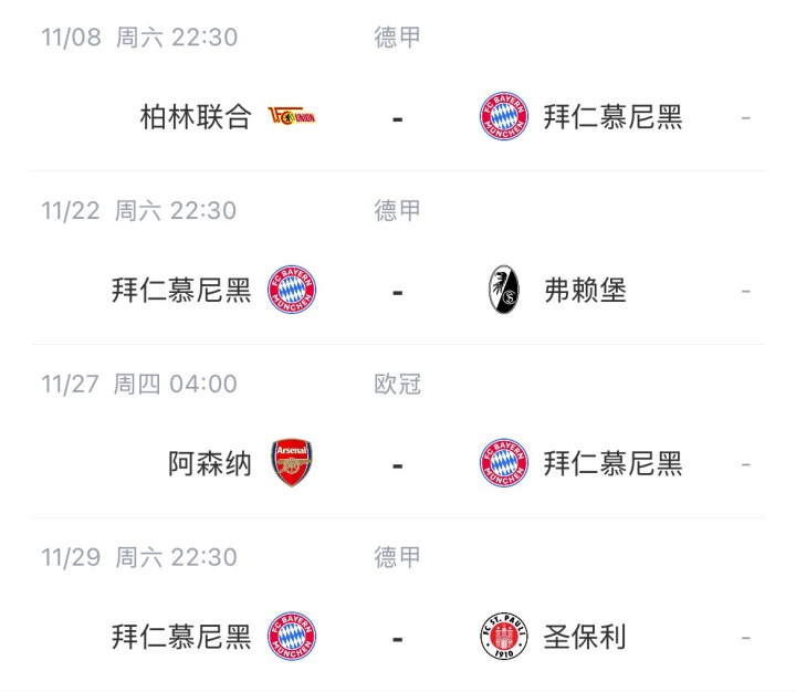 拜仁新赛季开局16连胜,持续刷新我方的记录。拜仁11月还有4场比赛,联赛分手对阵柏林纠合、弗赖堡和圣保利,欧冠11月27号对阵阿森纳。